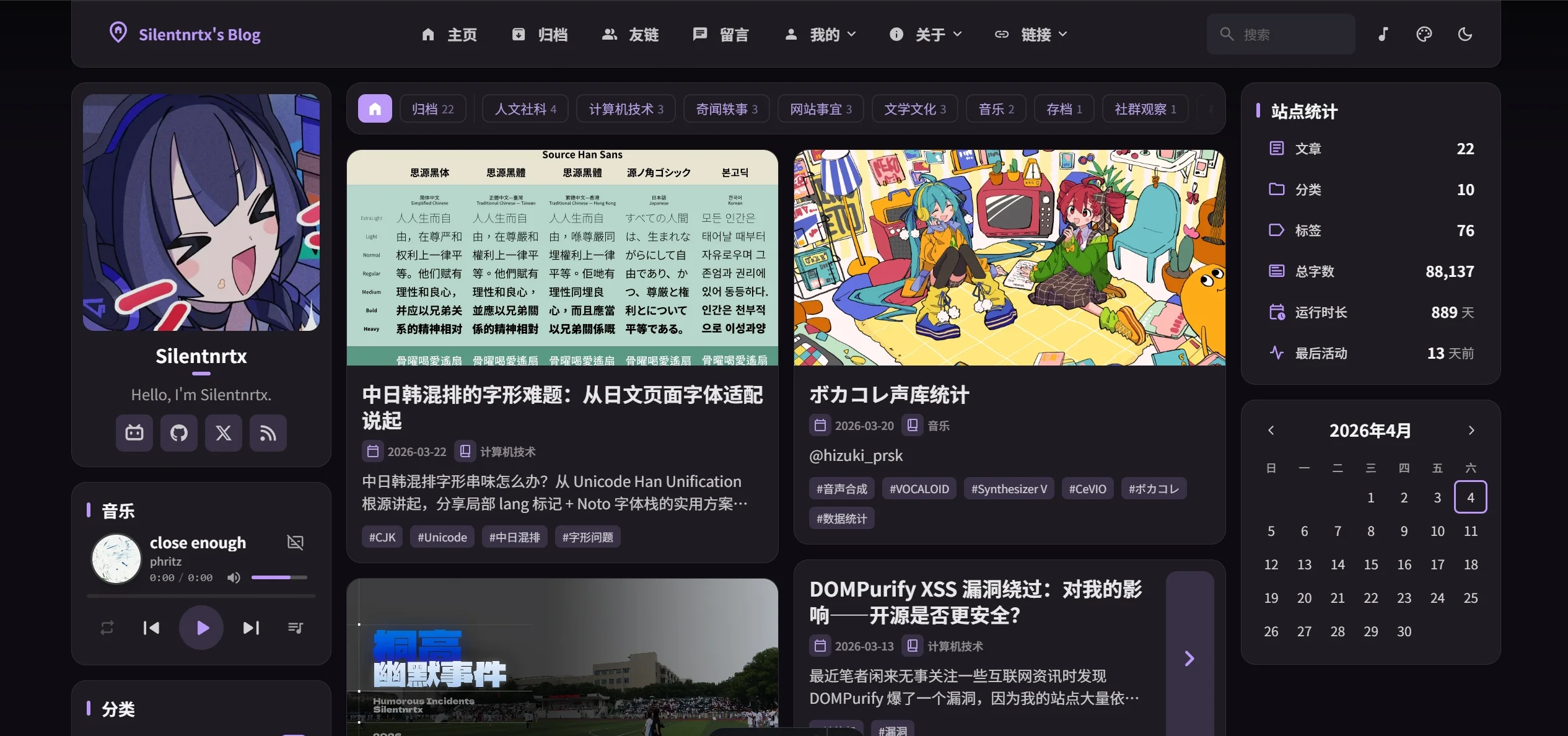 主题方面,我则选择了 Firefly 这一基于 Material Design 的博客主题。这一主题性能优秀、功能繁多,并且高度可定制,同时主题本身还提供了自动压缩图片等异常实用的功能(终于不用每次都用 squoosh 转成 Webp 了哈哈)。虽然它不像 Theme Hope 那样开箱即用,但是对于普通 Blogger 来说也是绰绰有余。